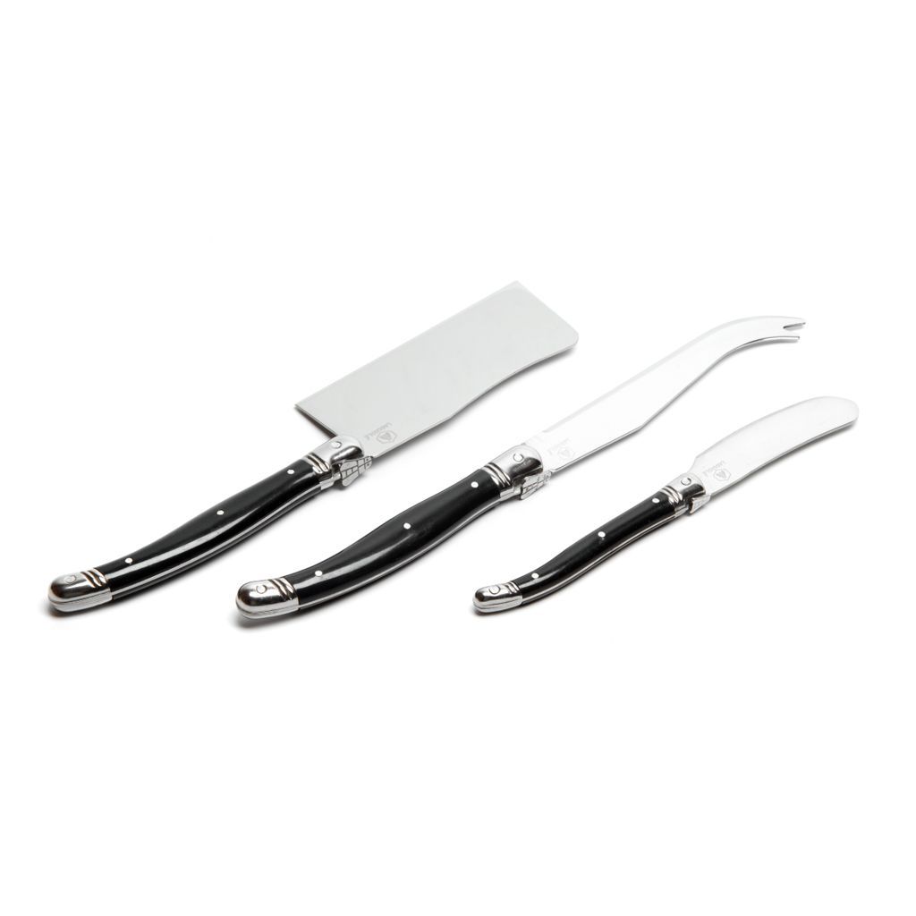 Set de queso de diseño francés con 3 utensillos de distintos tamaños. Los mismos vienen en una cuna de madera. Packaging: caja rígida de cartón laminada, la cual posee una ventana de cristal PVC. Medidas de la caja: 31 x 16 x 6 cm. Producto libre de BPA. Laguiole