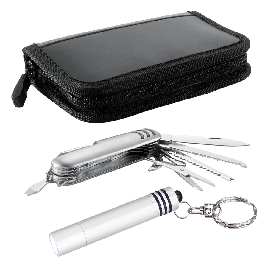 Set de Supervivencia "XD", incluye Cortapluma 12 funciones + Llavero-Linterna LED metálica de 9 cm + 3 pilas botón tipo AG3, presentación en elegante Estuche Negro con Gris.