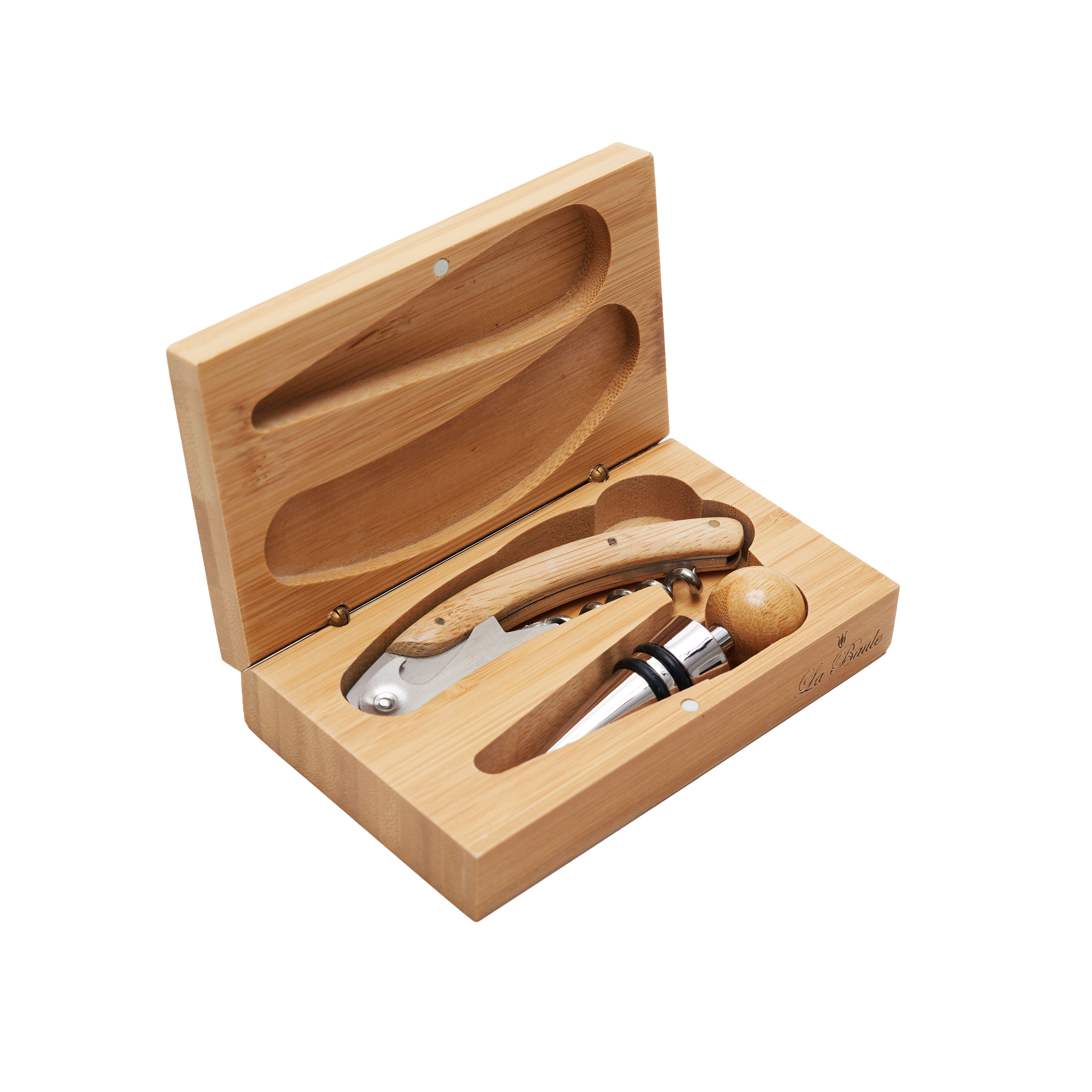 Set de vinos en caja de bamboo de dos elementos. Posee: Sacacorchos dos tiempos y tapón, realizado en acero inoxidable. Medidas de la caja: 13 x 8 x 3,2 cm. La Baule. LOGO24: Producto disponible para el servicio de logueo en 24 horas respetando unidades mínimas de logueo y 200 unidades máximas. Consultar términos y condiciones del servicio