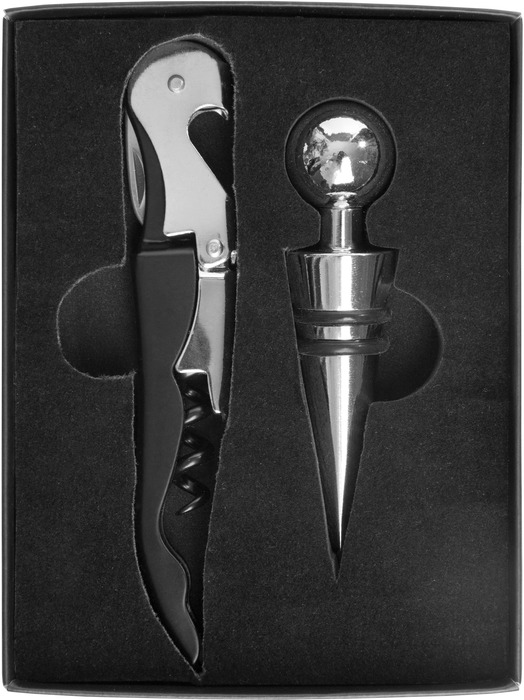 13,2 x 10 x 3 cm. Metal. Accesorios para vinos. Sacacorcho y tapón de metal. Estuche de cartón. Presentación en caja de regalo.