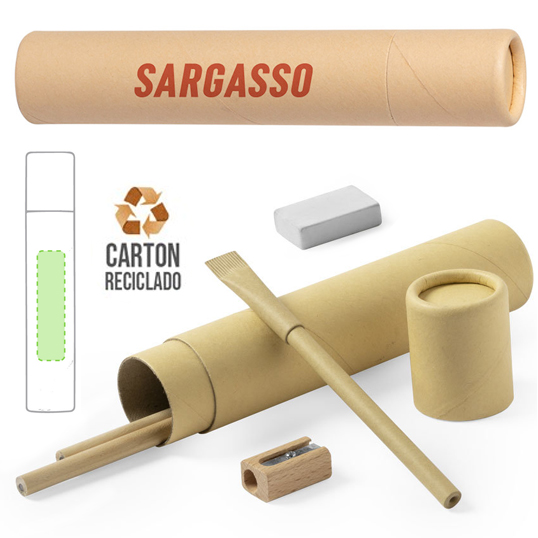 Set de 5 piezas en estuche cartón reciclado. Incluye 2 lápices de madera (sin afilar) con cuerpo cilíndrico de acabado natural, bolígrafo en cartón, sacapuntas de madera y goma de borrar. Tapa en cartón. 5 Piezas