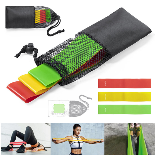 Set de gomas elásticas para los más deportistas. Incluye 3 cintas de 30x5 cm, fabricadas en resistente material TPE y 3 niveles de resistencia: ligera, media y fuerte. Presentado en funda de poliéster con cierre de cordón y accesorio de ajuste. 3 Piezas. Resistencia Baja, Media y Alta. Funda Poliéster