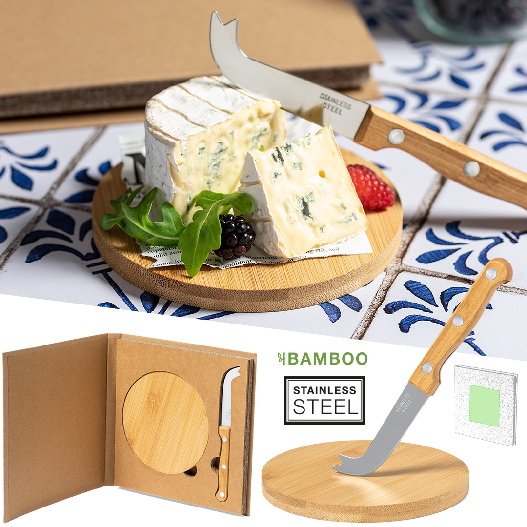 Set de quesos de línea nature, fabricado en bambú y acero inoxidable. Incluye tabla de corte y presentación redonda y cuchillo especial para queso. Presentado en estuche individual troquelado de cartón reciclado acabado kraft. 2 Piezas