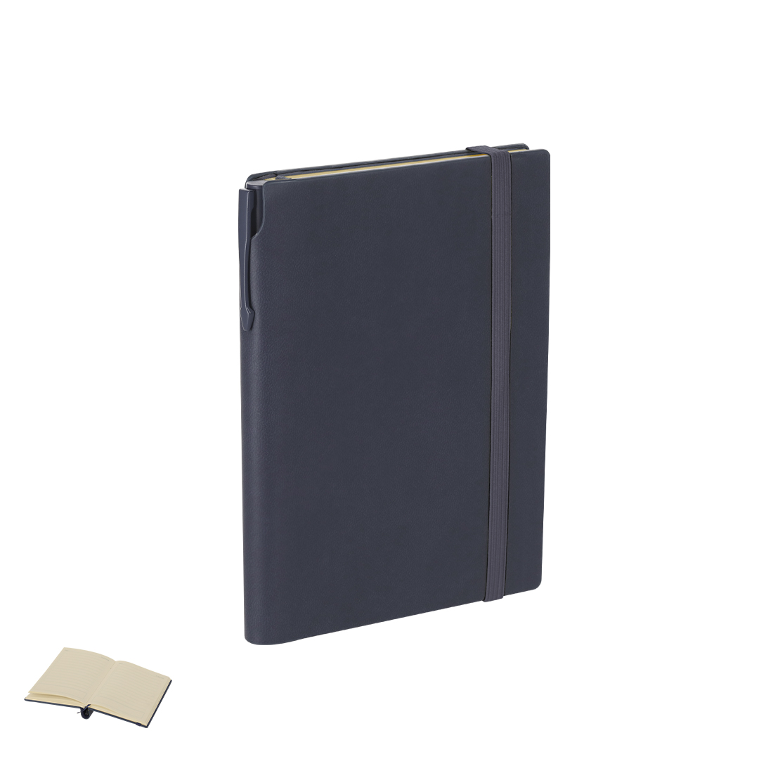 Set de bloc de notas y bolígrafo fabricados en PU reciclado y Aluminio Reciclado. El set incluye: - Bloc de notas fabricado en PU reciclada. Portadas rígidas, incluye 96 páginas de color crema, marcapáginas y cinta elástica de cierre a juego. Con distintivo logo PU reciclado. - Bolígrafo fabricado en Aluminio reciclado, con cuerpo en color sólido en acabado caucho. Dispone de clip, mecanismo pulsador y tinta azul. Incluye distintivo logo en Aluminio reciclado.El bloc dispone de un espacio para guardar el bolígrafo pudiendo llevarlo todo en un mismo sitio. Bloc PU Reciclada. Portada Rígida. 96 Hojas. Bolígrafo Aluminio Reciclado. Acabado Caucho