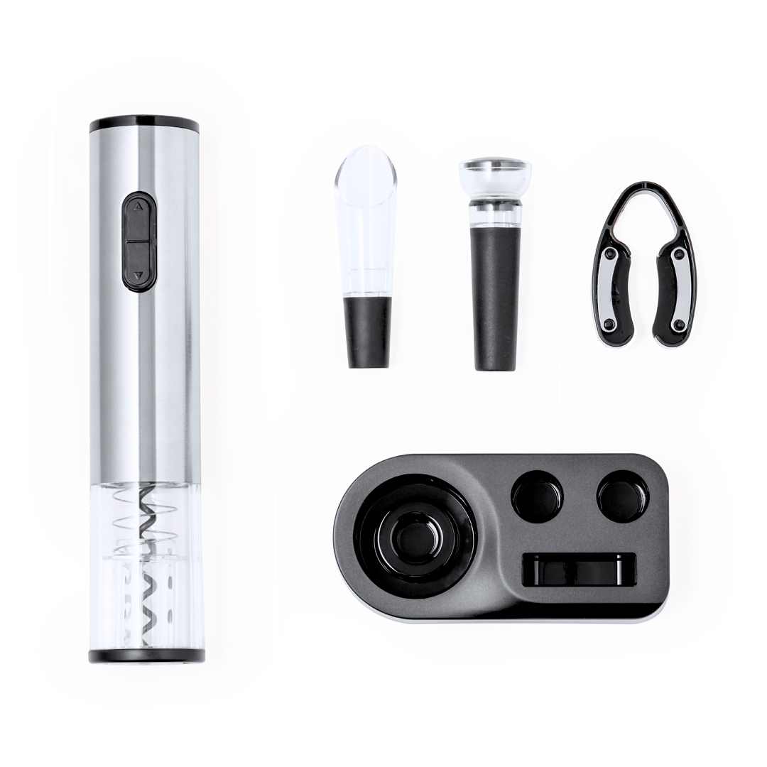 Práctico set de vinos con 4 accesorios. Contiene un sacacorchos eléctrico alimentado por 4 pilas AAA (no incluidas), decantador, tapón para botellas y cortacápsulas, con mecanismo a presión. Incluye, una elegante base negra para tener los accesorios ordenados. Presentado en caja de diseño kraft. 4 Accesorios