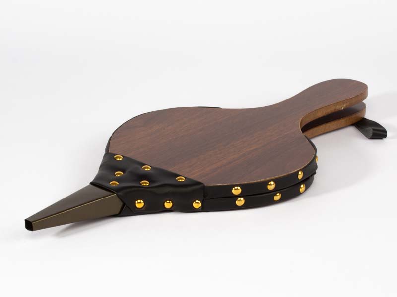Soplador grande de aire tipo Acordeón, para chimeneas y parrillas. Superficie MDF, reforzado con cuero y tachas. Toma de aire posterior. Amplia superficie para logo.