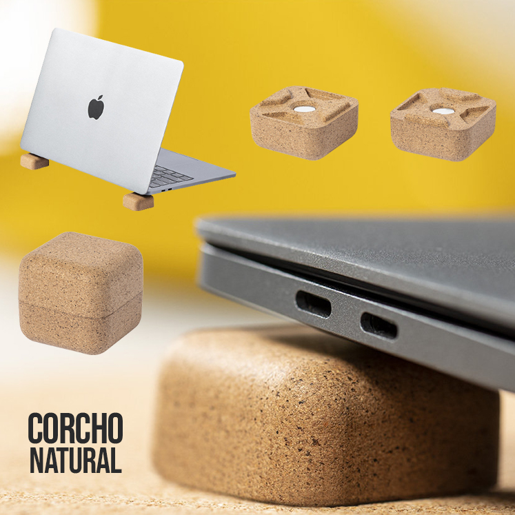 Compacto soporte de línea nature para ordenador portátil. Fabricado en corcho, para así fomentar la utilización de materias primas naturales y reducir las emisiones de contaminantes. Magnético y antideslizante, presentado en atractiva caja individual de diseño eco. Magnético