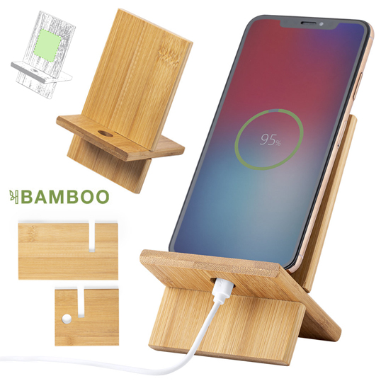 Soporte de línea nature fabricado en bambú procedente de cortes naturales. Muy fácil de montar, con ranura para cargar el dispositivo mientras se se encuentra situado en la base.