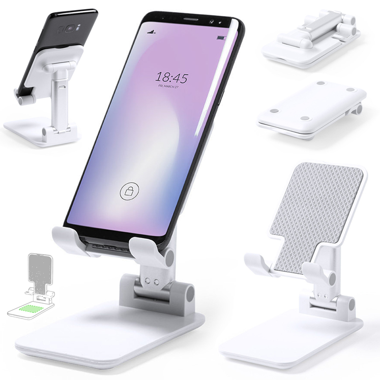 Soporte plegable para smartphones y tablets. Regulable en altura, incluye protecciones de goma antideslizantes en base y soporte. En sobrio acabado de color blanco y con amplia superficie de marcaje, especialmente indicado para impresión en tampografía. Presentado en atractiva caja de diseño. Plegable. Altura y Ángulo Regulable