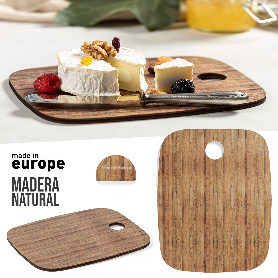 Tabla de corte y presentación fabricada en madera natural, con agujero para colgar. Amplia superficie de marcaje y distintivo Made In Europe.