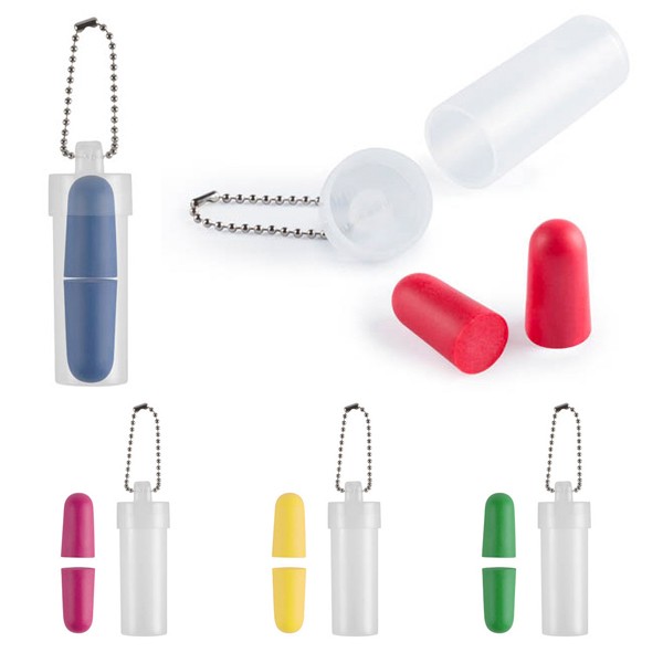 Confortables tapones para oídos en confortable material EVA de vivos colores. Presentados en estuche individual transparente con cadenita de transporte