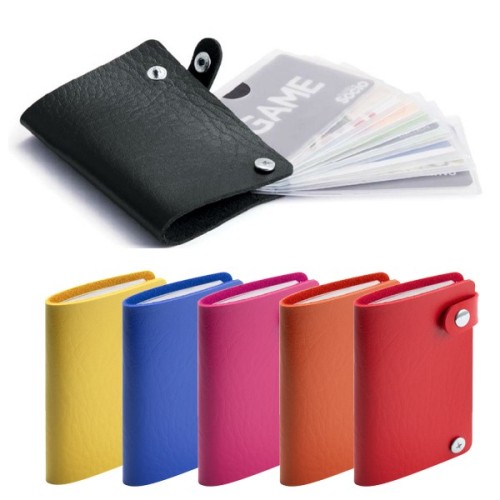 Tarjetero con cuerpo en suave acabado en polipiel de llamativos colores y doble cierre de corchete metálico. Con 10 compartimentos interiores en resistente PVC transparente. 10 Compartimentos