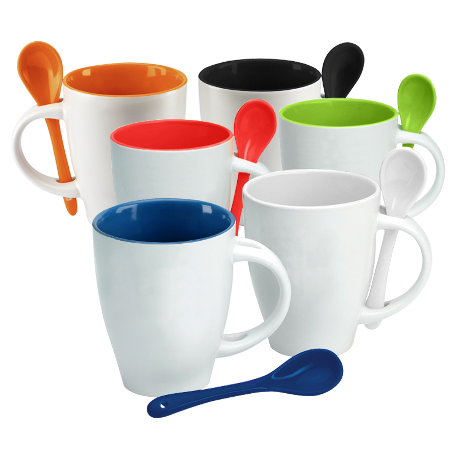 Tazón Cerámico Blanco opaco con interior y cuchara de color. Presentación en caja de cartón blanco.