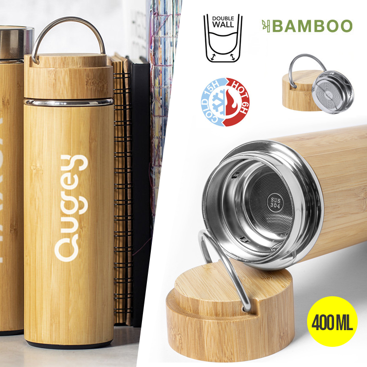 Termo en alta calidad acabado en bambú, de doble pared. 400 ml de capacidad, con tapón de seguridad libre de BPA e infusor integrado. Presentado en atractiva caja de diseño eco. 400 ml. Infusor Incluido