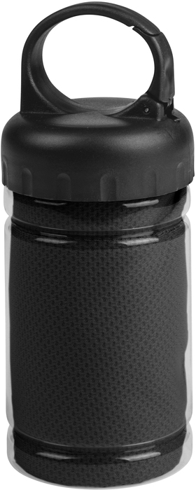Medidas toalla 79 x 29 cm / Medidas frasco:  Ø6,5 x 17 cm. Políester. Toalla de enfriamiento en un estuche de plástico transparente. Para un efecto refrescante humedezca la toalla con agua o agregue agua en el cilindro e incorpore la toalla. Tapa a rosca con mosquetón.