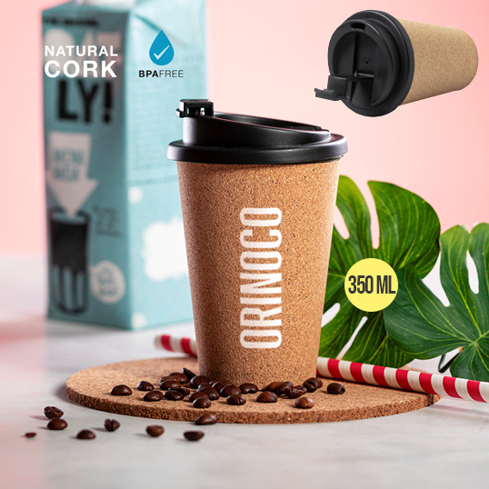 Vaso de línea nature, fabricado en corcho natural. 350 ml de capacidad, con tapa/dosificador de seguridad en PP, libre de BPA. 350 ml